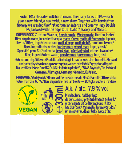 Wunderbar hazy und sonnengelb strahlt Dich das Hazy Double IPA an. Hopfen satt strömt in die Nase: ein fruchtiger Mix aus Erdbeere, Ananas, Zitrus, Heidelbeere, Pfirsch und Maracuja. Mit dem ersten Schluck zaubert unser Fusion IPA ein Lächeln ins Gesicht, eine wahre Hopfenfreude. Cremig weich und vollmundig saftig verwöhnt das Hazy DIPA den Gaumen und bezirzt Dich mit einer komplexen Aromatik. Pure Genussfreude, bei der Hopfenliebhaber voll auf ihre Kosten kommen.Herkunft