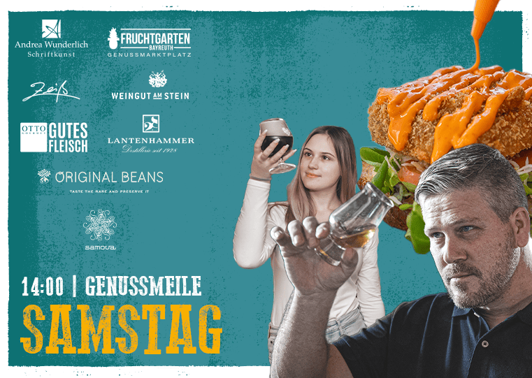mit dabei: Weingut am Stein, Destillerie Lantenhammer, Lindelberg Brennerei Zeiß, Vaihinger, Afri Cola, Festival Food by Liebesbier, Fruchtgarten Bayreuth, Lanzendorfer Backparadies x Opel’s Backwaren, Otto Gourmet, Maisel & Friends, Samova uvm.